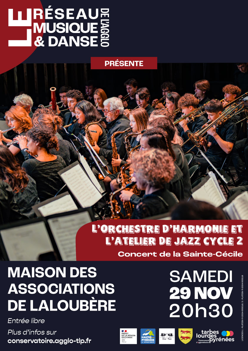 Vous êtes tous les bienvenus au concert de la Saint-Cécile 2025 de l’Orchestre d’Harmonie et de l’Atelier de Jazz Cycle 2 de l’Agglomération Tarbes Lourdes Pyrénées qui aura lieu Samedi 29 Novembre 2025 à 20h30 à la Maison des Associations de Laloubère (au croisement de la rue du 19 mars 1962 et de l’avenue des sports).